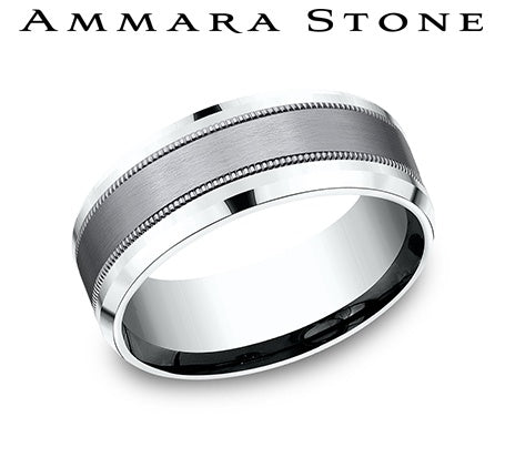 Gent's Ammara Stone Wedding band in Rhodium Finished 14K White Gold along with Grey Tantalum Center with a Satin Finish with Milgrain detailing on the edges.